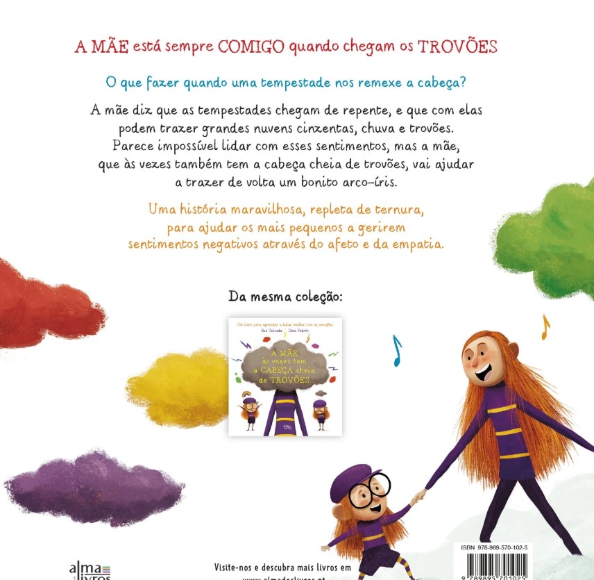 A mãe diz que as tempestades chegam de repente, e que com ela podem trazer grandes nuvens cinzentas, chuva e trovões. Parece impossível lidar com esses sentimentos, mas a mãe, que às vezes também tem a cabeça cheia de trovões, vai ajudar a trazer de volta um bonito arco-íris.
