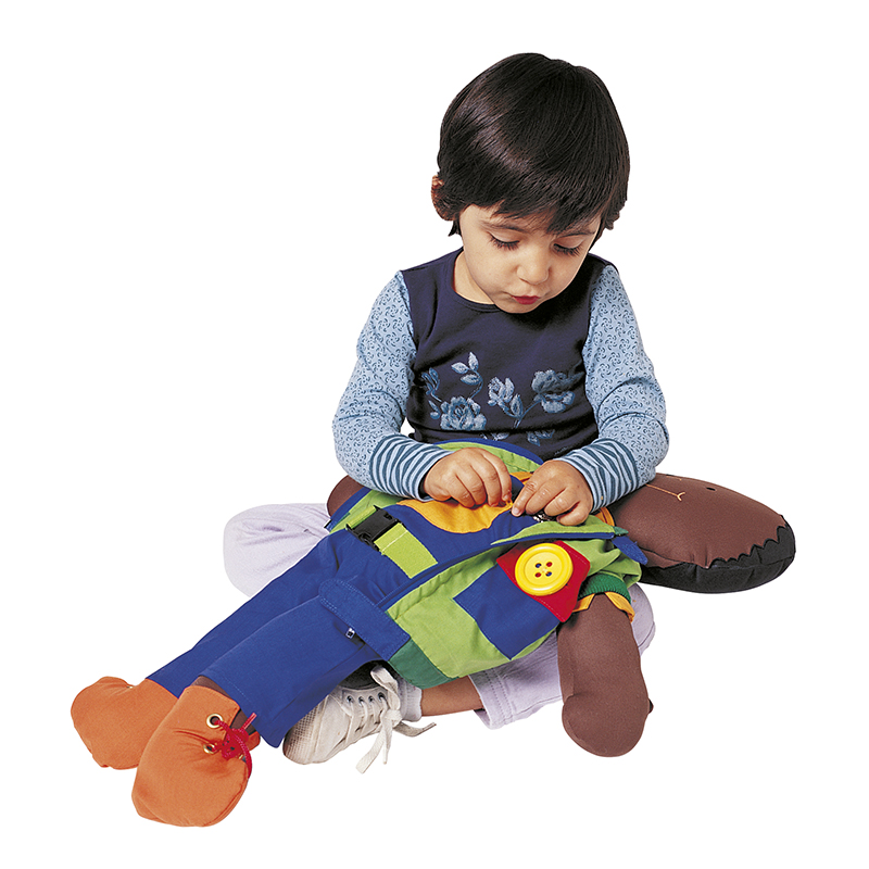 A variedade de sistemas de fixação e fechamento promove a aprendizagem de atividades da vida diária, como se vestir, abotoar, amarrar os cadarços, etc.
