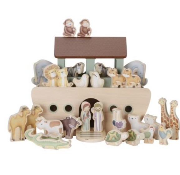 Este conjunto de 31 peças inclui a arca com uma porta e uma rampa removível para que todos os animais possam subir a bordo. Noé leva a sua esposa e um grande grupo de animais numa viagem através do oceano: 2 pombos, uma galinha, um galo, 2 tartarugas, 2 macacos, um leão e uma leoa, 2 avestruzes, 2 tigres, uma vaca, um touro, 2 crocodilos, 2 girafas, 2 ursos polares, 2 zebras, 2 elefantes e 2 camelos.