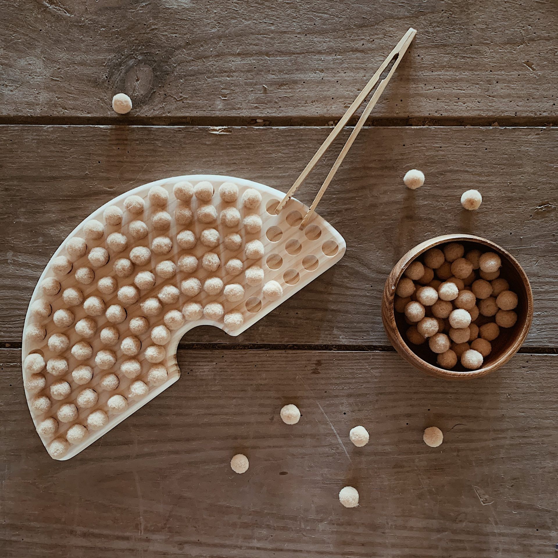 Escolhe se preferes bolas de madeira ou de feltro para o teu arco-íris. Também recomendamos as pinças, para ajudar a melhorar a motricidade fina.