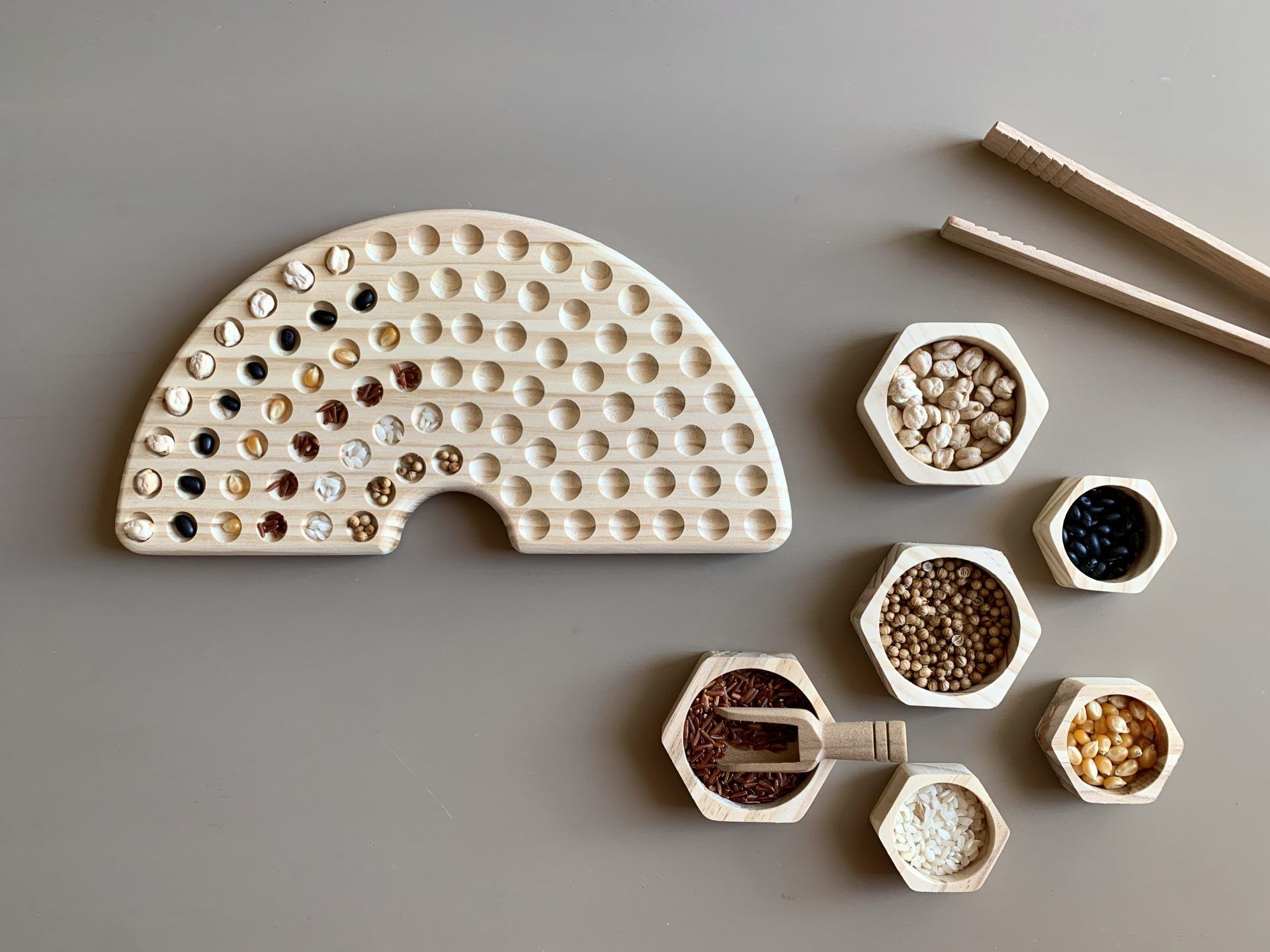 Este tabuleiro é feito em madeira de pinho, com 87 cavidades distribuídas em forma de arco-íris.