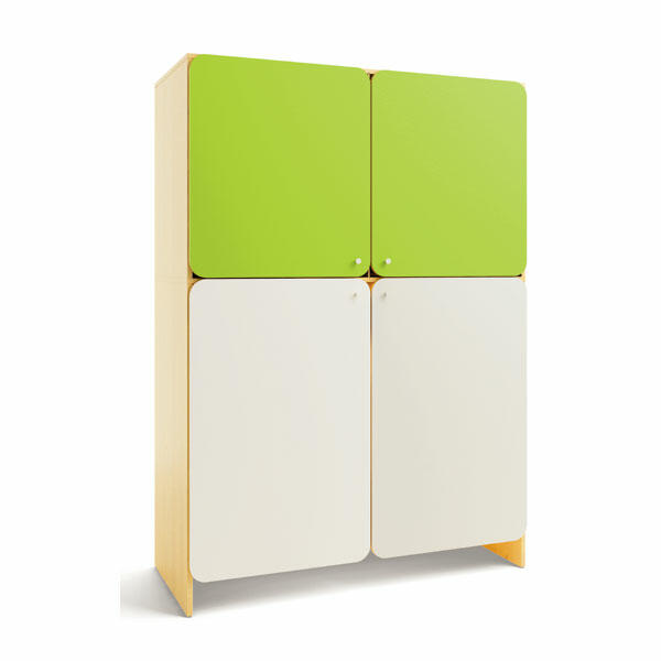 As 4 portas deste armário são feitas em MDF de 12 mm, numa combinação de branco e verde-claro, proporcionando um toque moderno e distinto ao móvel. As portas têm puxadores em alumínio, facilitando a abertura e o fecho.