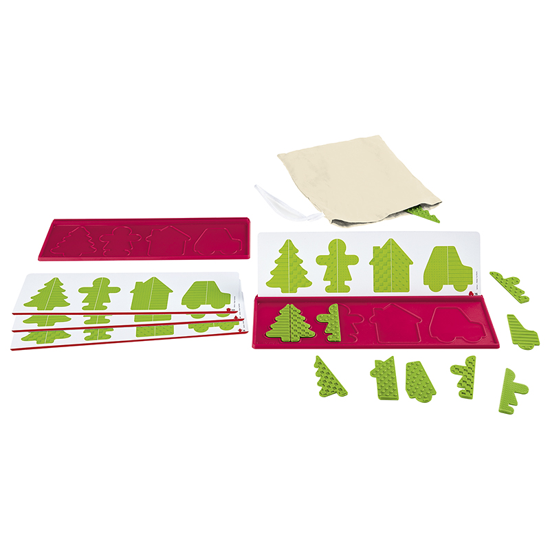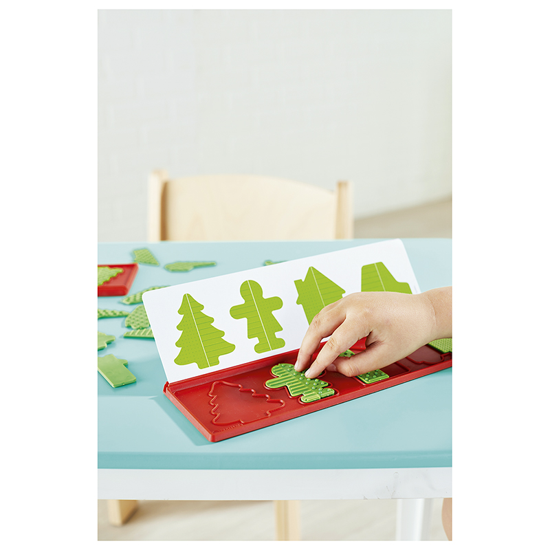 Depois de se familiarizarem com as diferentes texturas e formas das peças através de pequenos jogos de reconhecimento tátil e visual, cada criança recebe uma folha para deslizar em sua placa. Devem preencher a sua placa seguindo o modelo proposto pela folha.