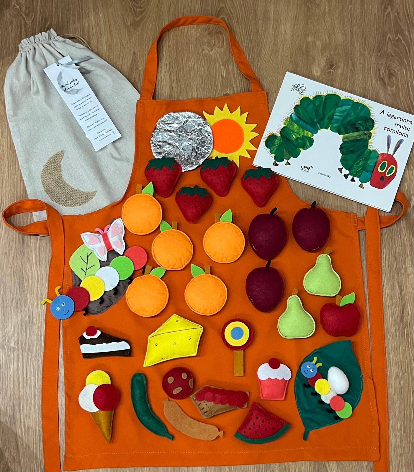 O avental é o cenário físico para acompanhar a história "A Lagartinha Comilona" de forma a envolver as crianças e a transportá-las para o mundo da fantasia.