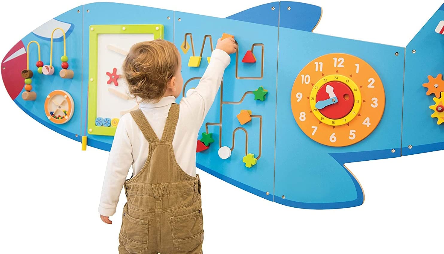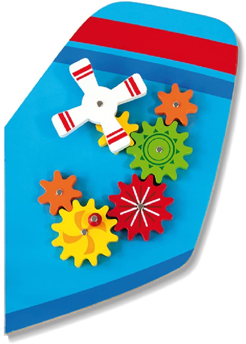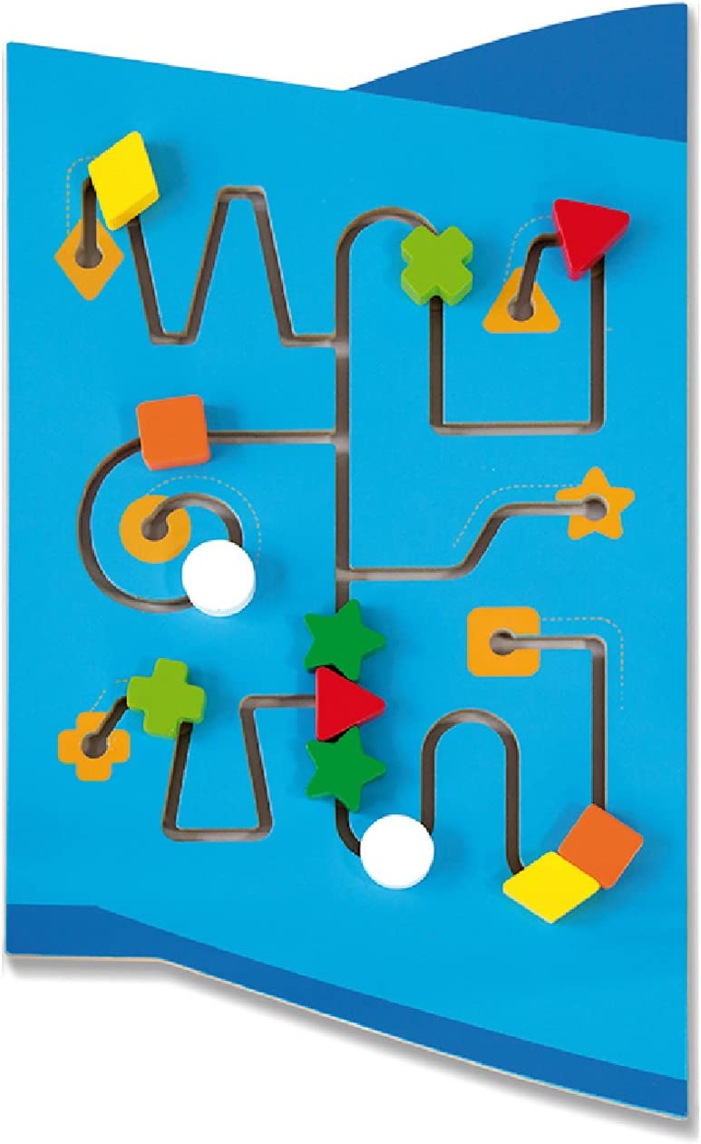 Este divertido jogo de parede possui 5 atividades diferentes que requerem manipulação, estimulando e promovendo a coordenação olho-mão e habilidades motoras finas. Suas atividades incluem: um relógio com movimento das mãos, labirinto de contas de arame, penas magnéticas, labirinto de formas e engrenagens.