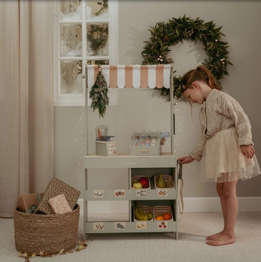 Com esta encantadora banca de mercado em madeira, as crianças podem brincar às compras e criar o seu próprio espaço de venda. O toldo em tecido confere um verdadeiro ambiente de mercado, enquanto o quadro de giz e os cartões ilustrados permitem expor os produtos de forma criativa.