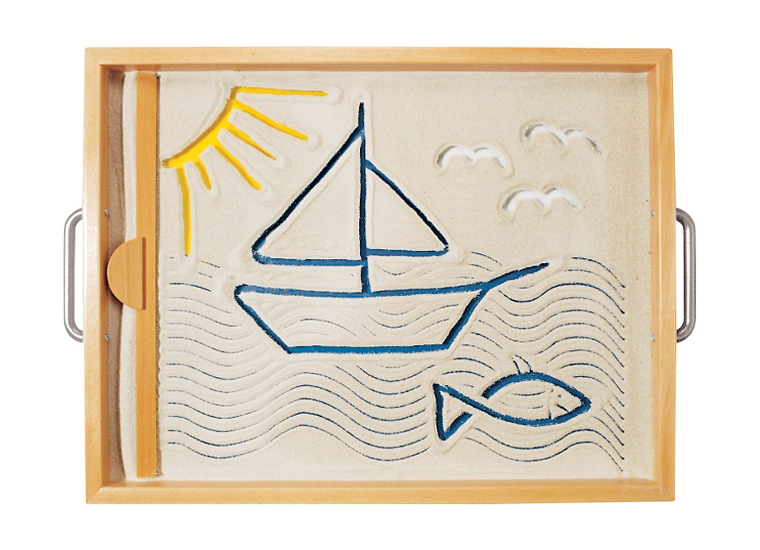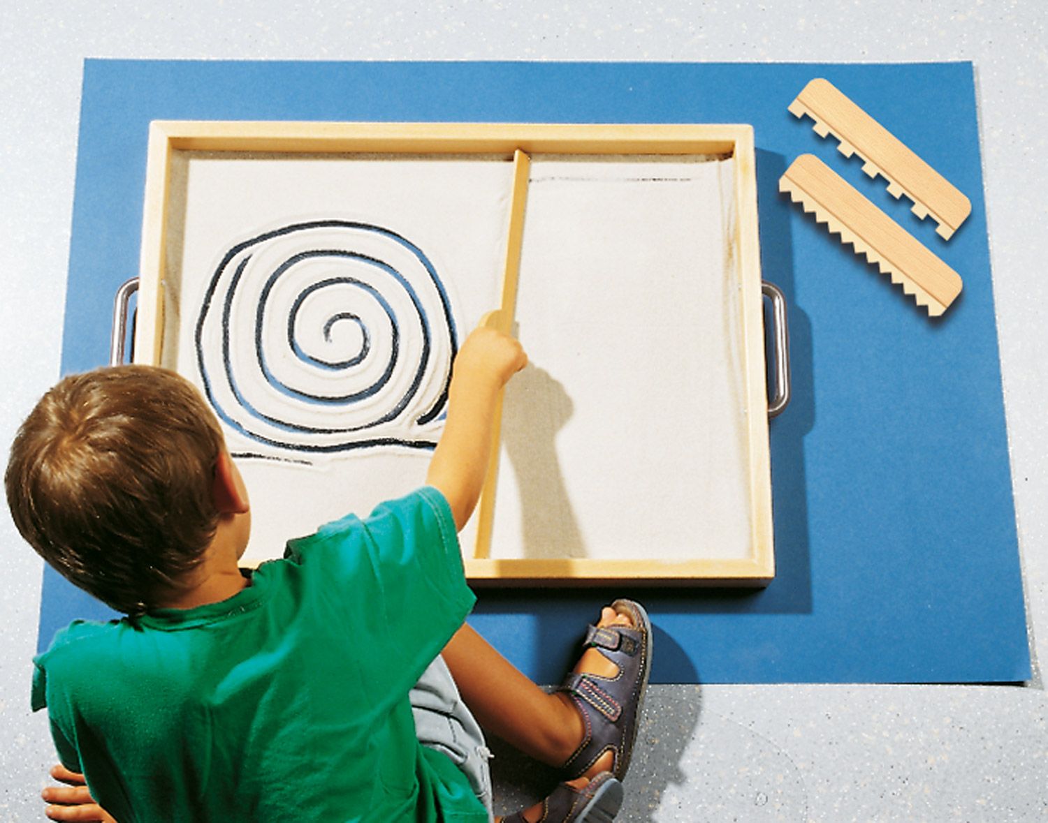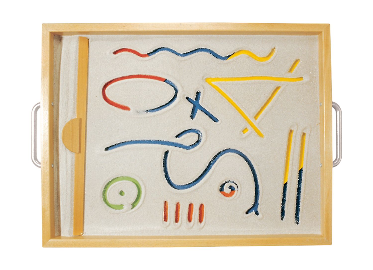 O especial desta caixa de areia é o fundo de vidro. Papel colorido ou imagens personalizadas podem ser colocados sob o fundo de vidro. Traçando marcas com os dedos, ancinhos ou paus, o substrato colorido se torna visível. Surgem padrões e imagens maravilhosas, mas que as crianças podem apagar a qualquer momento com o empurrador de areia, para realizar novas ideias.