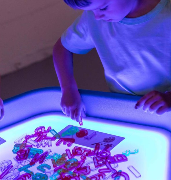A superfície iluminada utiliza a luz como elemento central de aprendizagem, enquanto o suporte ajustável em altura garante excelente estabilidade e conforto, permitindo que a bandeja seja utilizada por crianças de várias faixas etárias.