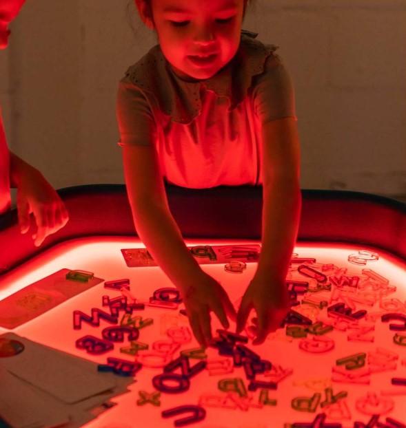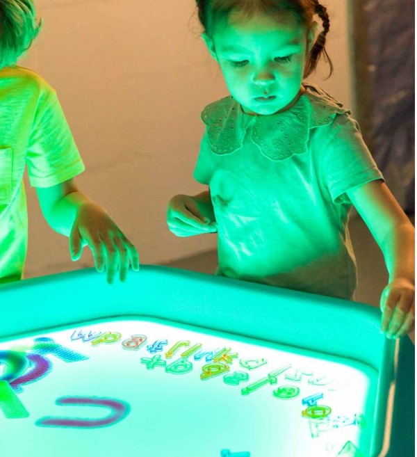 A área LED é ideal para atividades sensoriais e educativas com materiais secos e translúcidos, como blocos acrílicos, formas geométricas, folhas de acetato, celofane, contadores coloridos ou elementos naturais translúcidos. A luz realça a exploração da cor, transparência, sobreposição de formas e sombras, promovendo uma aprendizagem ativa e visualmente estimulante.