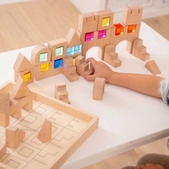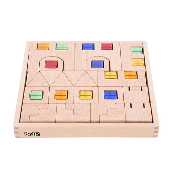 Os blocos de madeira natural suave, com inserções de cubos de gemas de cristal, proporcionam explosões de cor cativantes, despertando a curiosidade da sua criança.