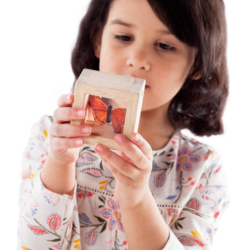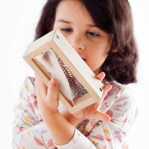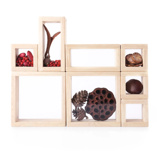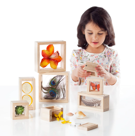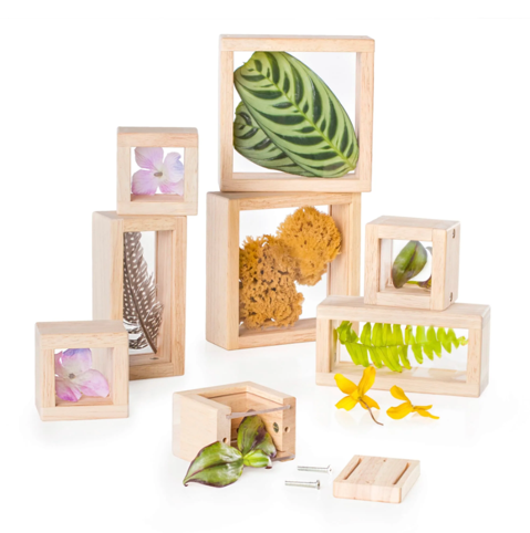 Colecionem pequenos objetos, materiais naturais e peças sensoriais para colocar nos belos Blocos do Tesouro. As molduras de madeira lisa, com janelas transparentes em acrílico, têm um painel removível para que possam inserir pequenos objetos para observação ou exposição.