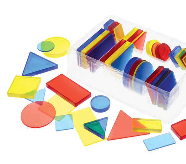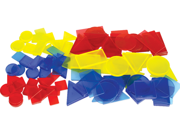 Conjunto de figuras translúcidas que diferem em tamanho e espessura. Perfeito para introduzir os conceitos de tamanho, forma e cor. Também é indispensável para exercícios de geometria.
