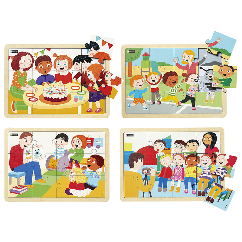 Ilustrações ricas e coloridas impressas na madeira promovem a linguagem. Molduras para encaixar as peças e facilitar o armazenamento.