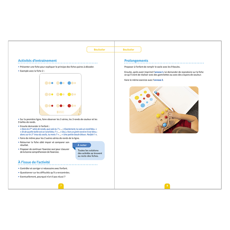 A criança coloca as 9 bolas de 3 cores e 3 diâmetros diferentes (pequeno, médio, grande) na base usando a pinça tesoura de madeira, primeiro livremente e depois de acordo com as indicações fornecidas pelas fichas.