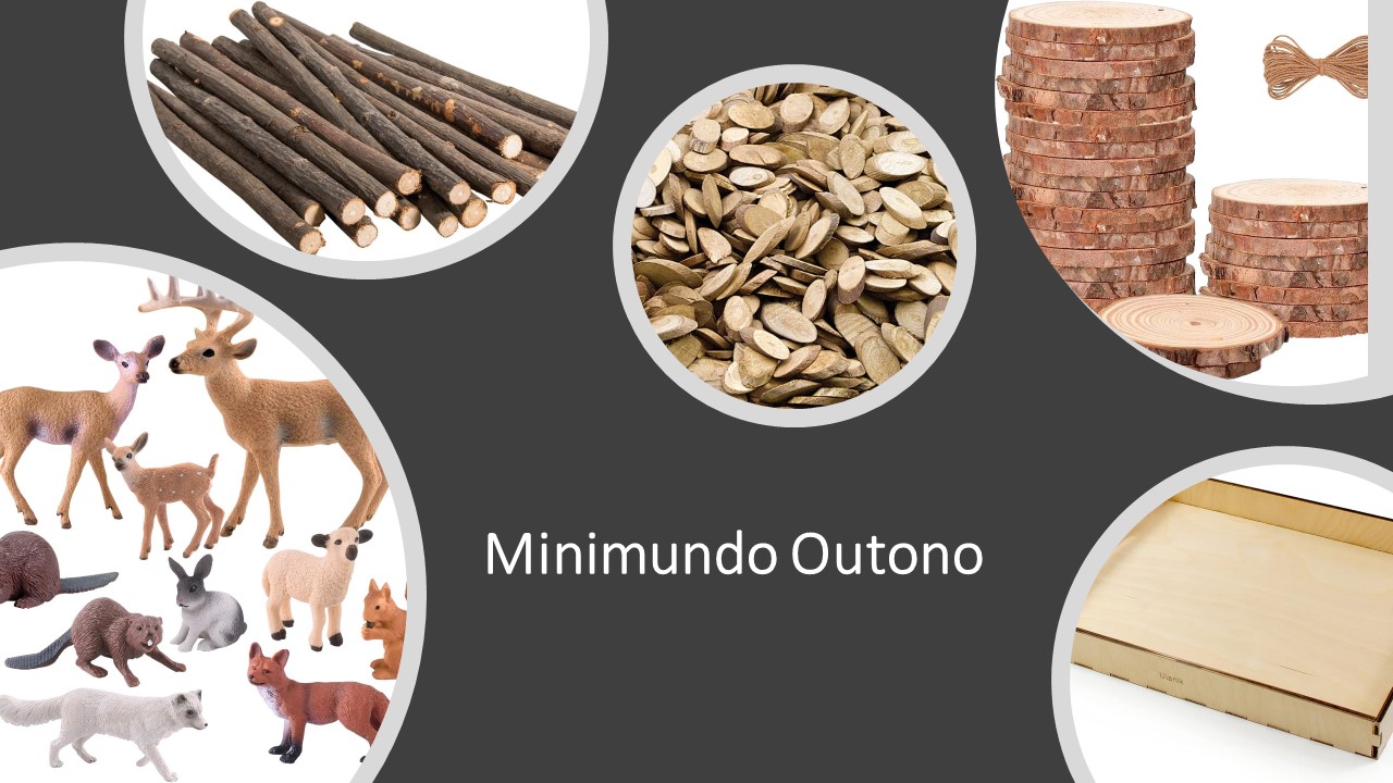 - Minimundo Outono (tabuleiro madeira + materiais naturais + animais