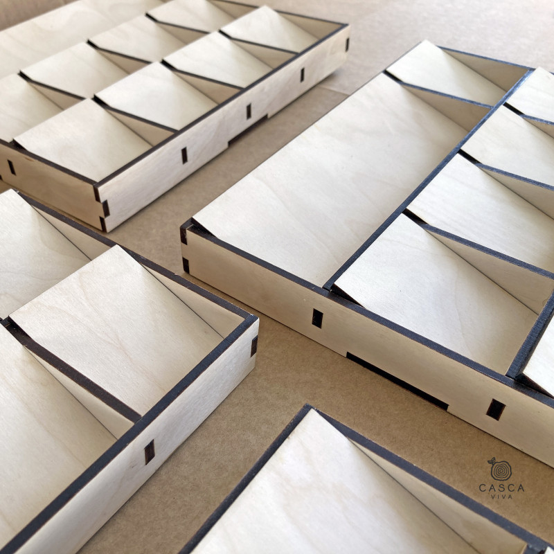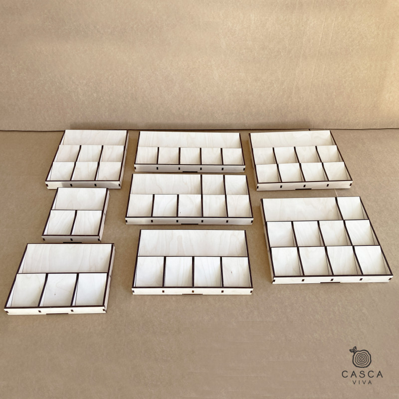 São 8 caixas de madeira com diferentes compartimentos para classificar as diferentes palavras de uma frase (nome, verbo, adjectivo, pronome, proposição, interjeição...).
