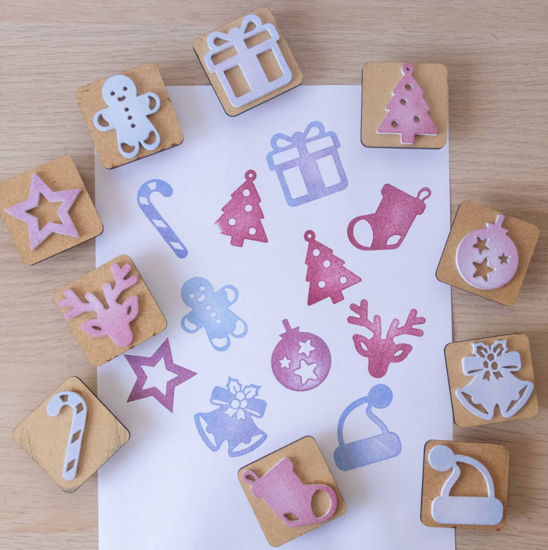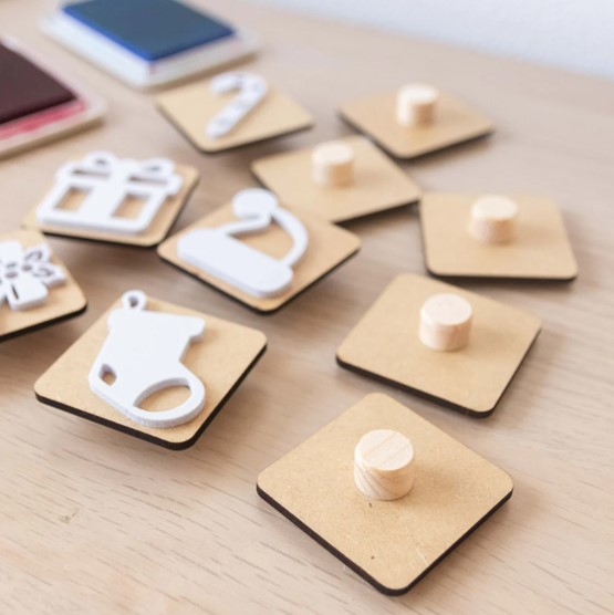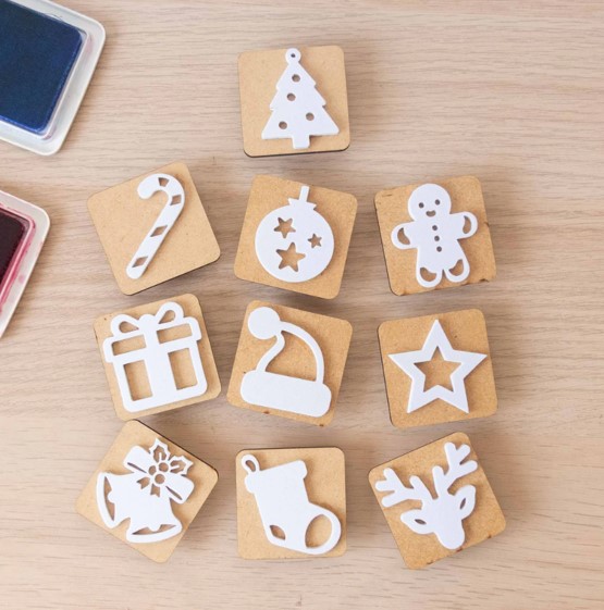 10 carimbos com a temática do Natal, cada um com tamanho de 5 cm x 5 cm.