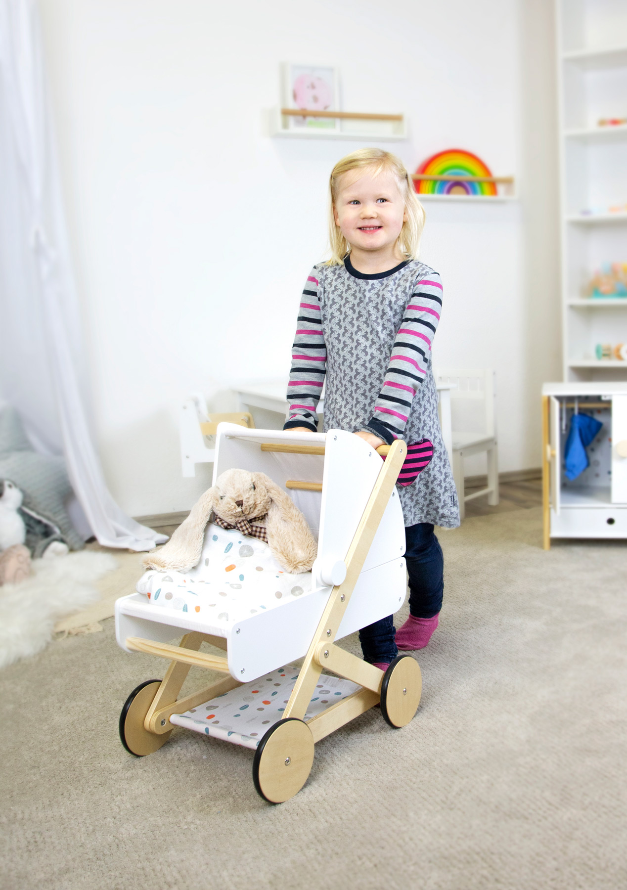 A linha escandinava, o esquema de cores subtil e os elementos de design repetidos da série de móveis para bonecas "Little Button" resultam numa aparência geral harmoniosa.