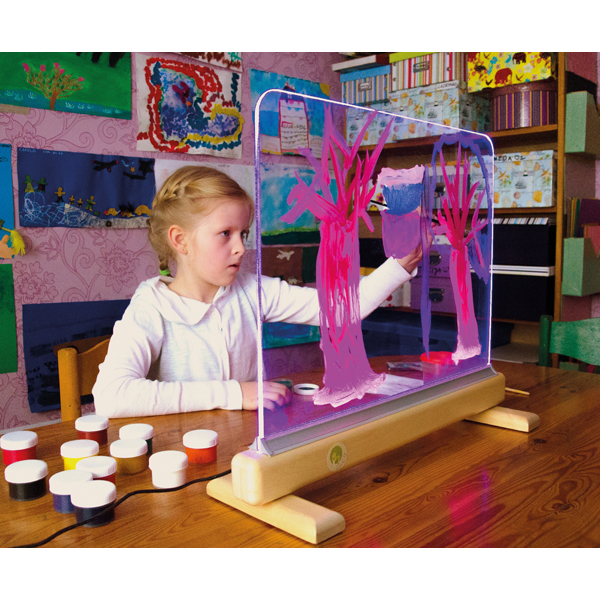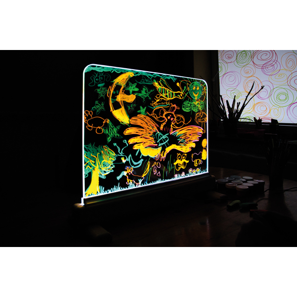 É um vidro temperado brilhante onde se pode pintar. A unidade de controlo do dispositivo permite selecionar entre 16 cores de iluminação de base e criar uma nova obra de arte a cada vez. Pode-se criar diferentes impressões na peça de arte apenas mudando a iluminação. Por isso, não é necessário apagar imediatamente as paisagens criadas - mude a cor e desfrute de ornamentos desconhecidos do desenho. Ao contrário de um desenho em papel que não pode ser apagado, a tábua de luz mágica pode ser renovada várias vezes. Pode escolher as suas ferramentas de pintura: aguarelas, guache, marcadores à base de água e canetas de ponta de feltro à base de água, pincéis e outros acessórios. Como a tábua é adequada para desenhar de ambos os lados, as crianças podem criar em equipa, expressar suas emoções, complementar-se e sentir o estado de espírito do companheiro.