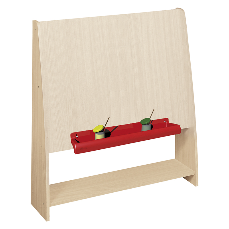 Cavalete para 2 crianças para fixar na parede ou na parte de trás de um grande móvel MobiNathan. É composto por um painel inclinado de madeira, uma prateleira e uma bandeja removível vermelha.