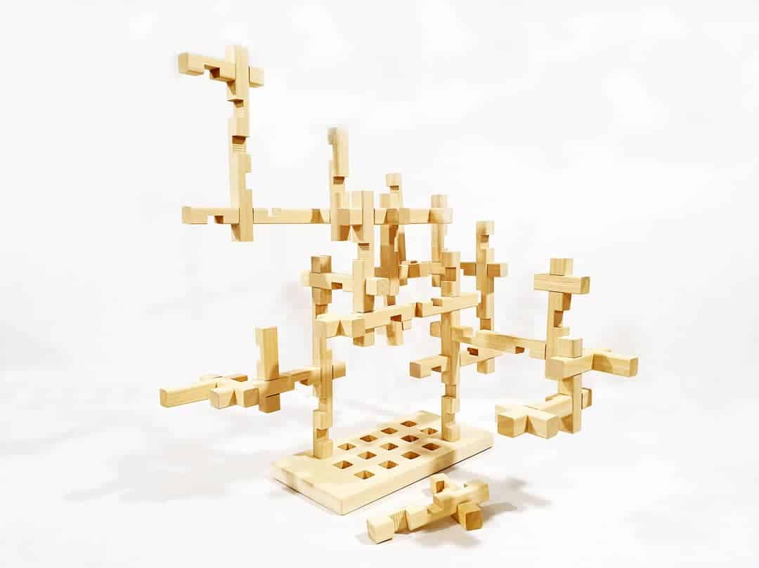 CEO é um conjunto de construção em madeira de bétula ou Ayoux, composto por pedaços de madeira de diferentes comprimentos e com reentrâncias de meia madeira.
