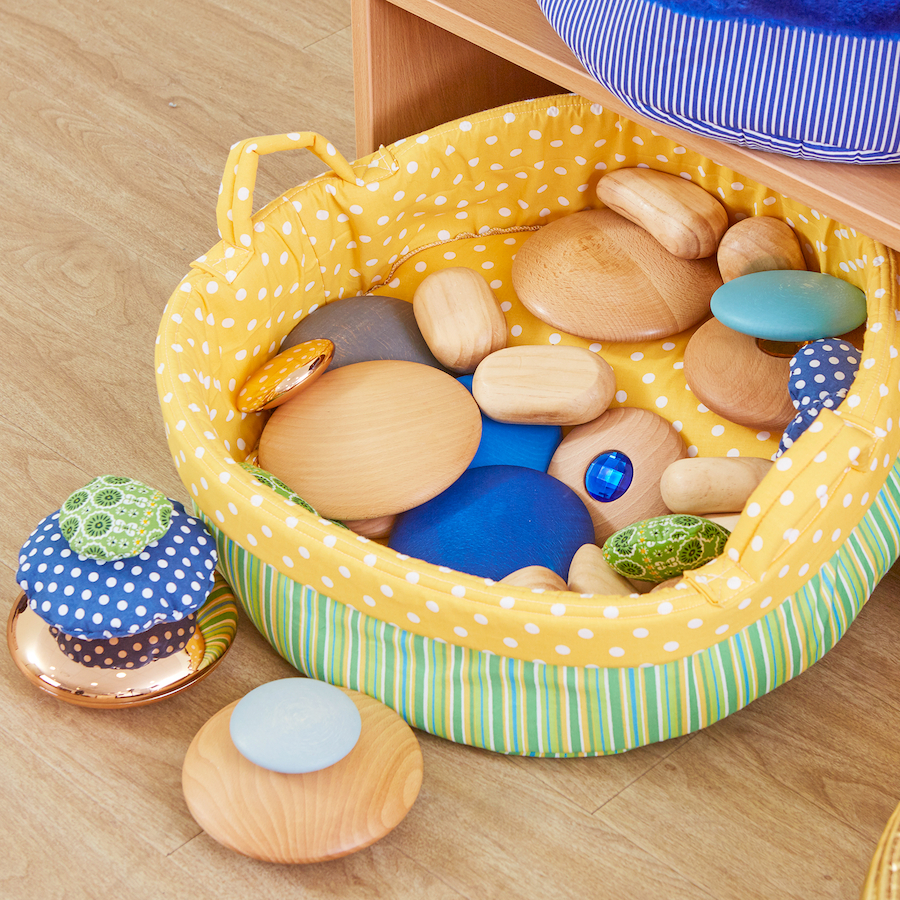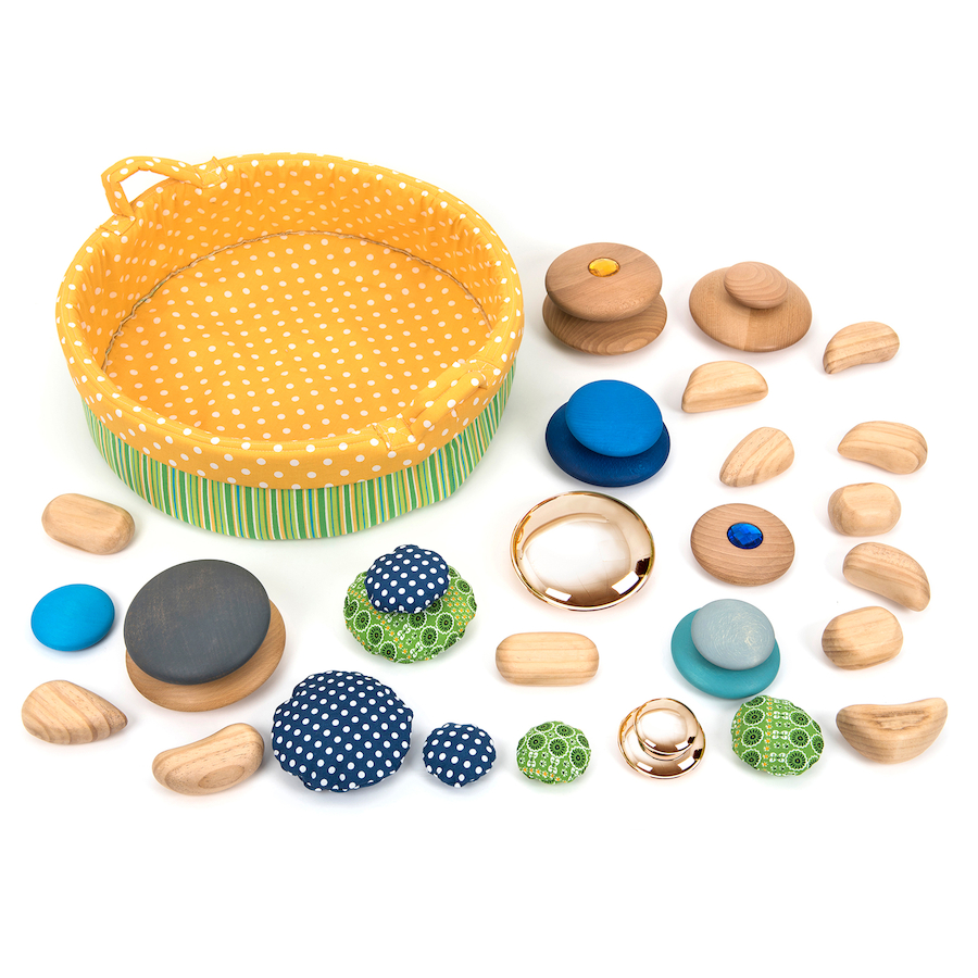 Compare, contraste, transporte, organize, empilhe e explore. Olhe para a brilhante, sinta as pedrinhas de madeira suaves e descubra as versões com padrões de tecido. Incentive as crianças a experimentarem equilibrando as pedrinhas umas em cima das outras, descobrindo o próprio reflexo nas pedrinhas espelhadas e rodando as pedrinhas no chão.