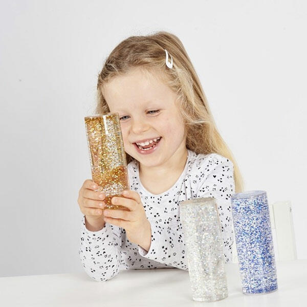 Adicione um toque de brilho à brincadeira sensorial com o nosso Conjunto TickiT® Sensory Glitter Storm. Três cativantes agitadores cilíndricos de plástico transparente contendo um líquido à base de glicerina não tóxico e água com brilho. Quando agitados, criam uma tempestade de brilho que gira e, de repente, abranda e cintila, ideal para capturar a atenção da criança.