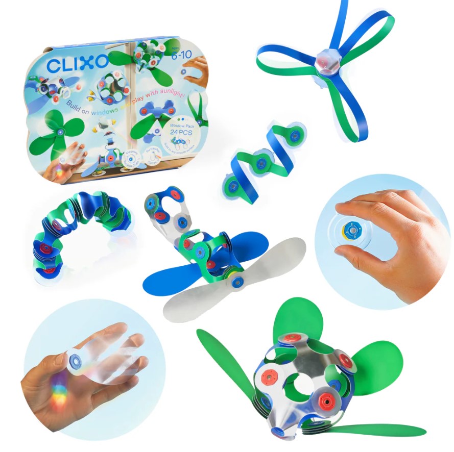 Este conjunto contém 24 peças em 10 formas únicas da Clixo, incluindo acessórios com ventosas.