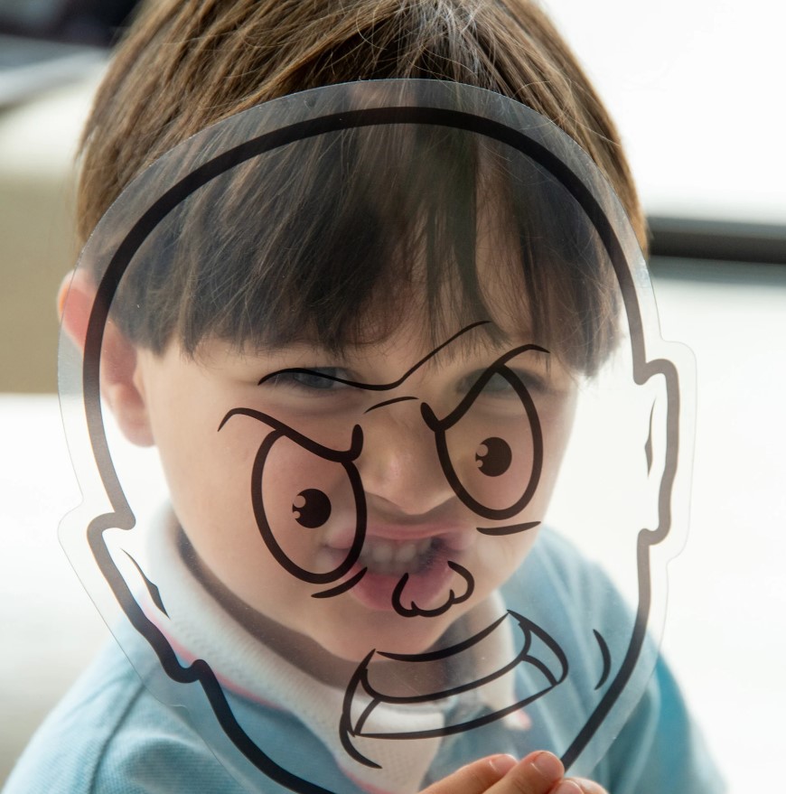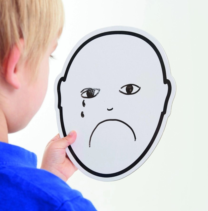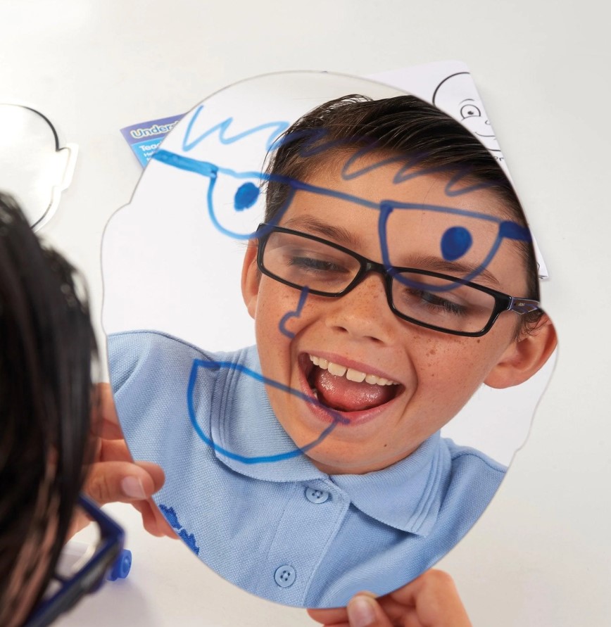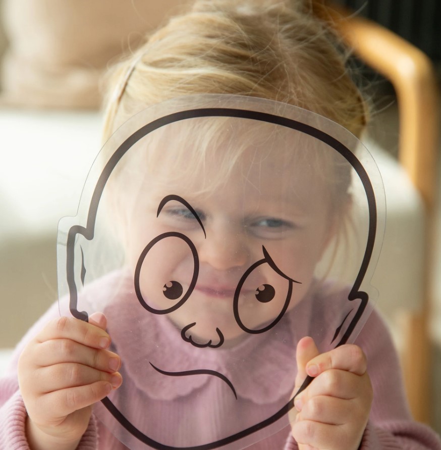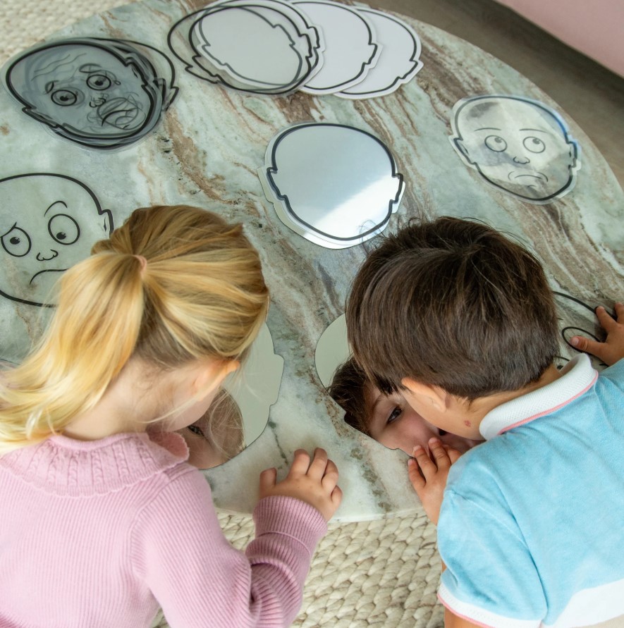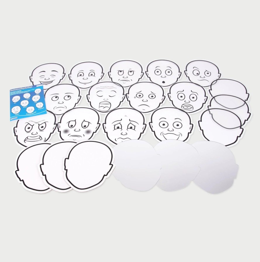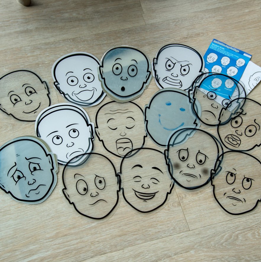 Os rostos com diferentes expressões, feitos de plástico transparente, são ideais para usar com painéis de luz ou contra uma janela. As placas e folhas de acetato em branco permitem que as crianças desenhem expressões com marcadores apagáveis, enquanto os espelhos em forma de rosto ajudam-nas a observar a própria expressão e reconhecer emoções.