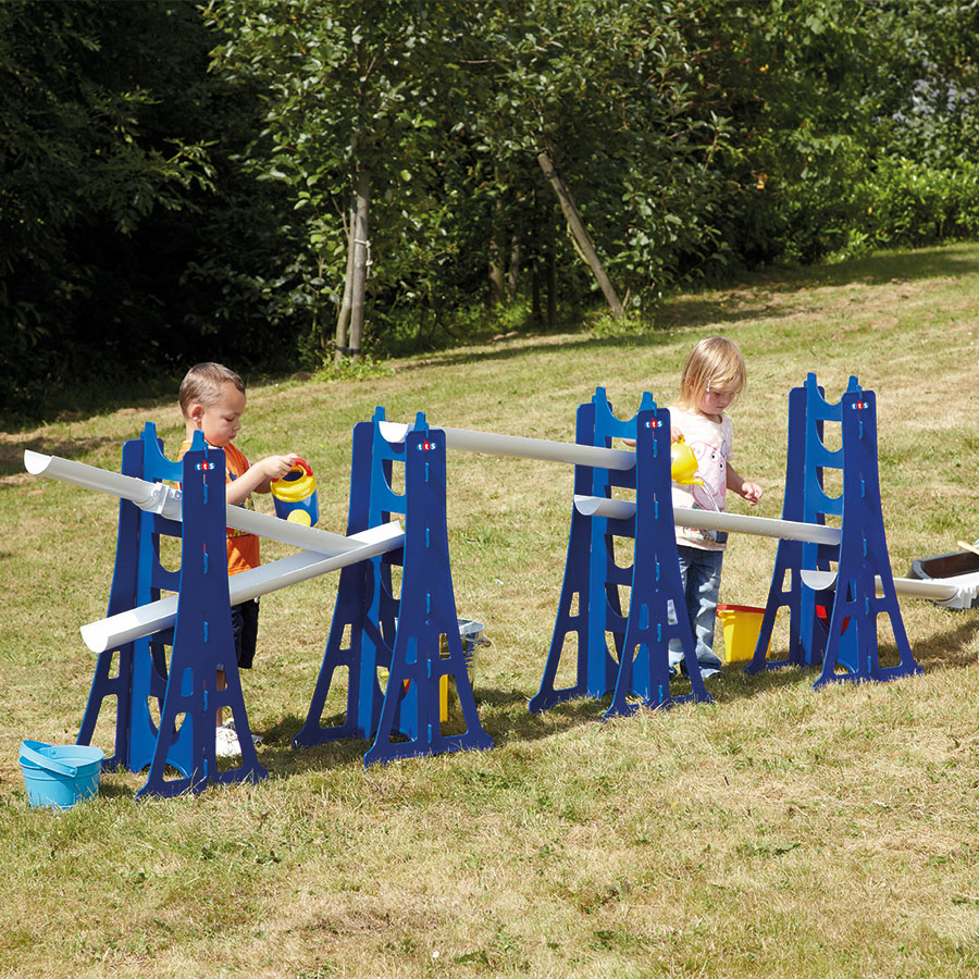 Os suportes são movidos pelas crianças e utilizados para construir um percurso - um processo que envolve brincadeira, conversa, observação, planeamento, questões, experiências e testes. Os tubos são feitos de plástico de resistência industrial, sendo muito robustos e duráveis. Utilize o equipamento em várias configurações com água, veículos ou bolas.