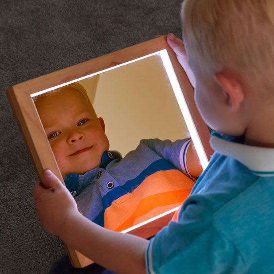 Estes espelhos são uma adição maravilhosa a qualquer ambiente, não apenas como espelhos, mas como fontes de iluminação. Estes espelhos têm um interruptor simples para ligar as luzes e criar uma sensação extra de admiração e fascínio para as suas crianças. Pode usá-los em cima de mesas ou no chão. Utilize-os para espreitar ou como uma superfície para uma variedade de cenários, desde contar até criar pequenos mundos.