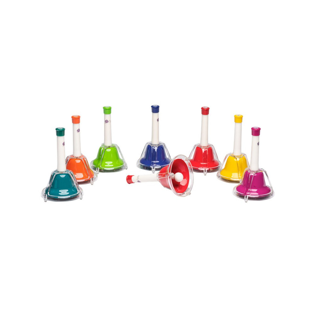 PERCUSSÃO, APRENDIZAGEM: Estes sinos podem ser agitados ou tocados; eles oferecem 8 notas separadas que vão do Dó grave ao Dó agudo.