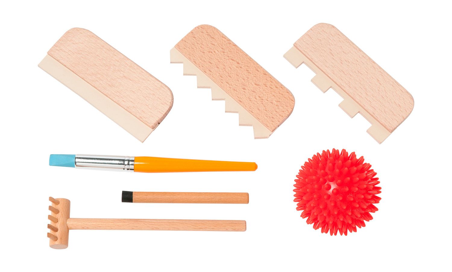 1 bola de superfície lisa (Ø 6 cm), 1 pincel plano de 1 cm de largura, 1 escova de borracha de 18,5 cm, 1 lápis de areia, 1 ancinho com cabo de 4 cm de largura, 2 ancinhos de diferentes formas, 1 alisador com lâmina de borracha de 11 cm de largura.