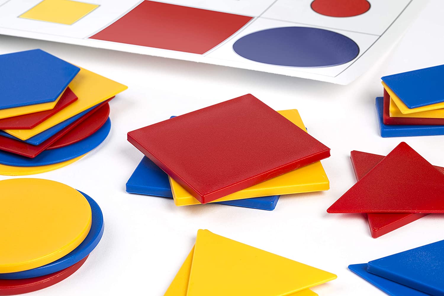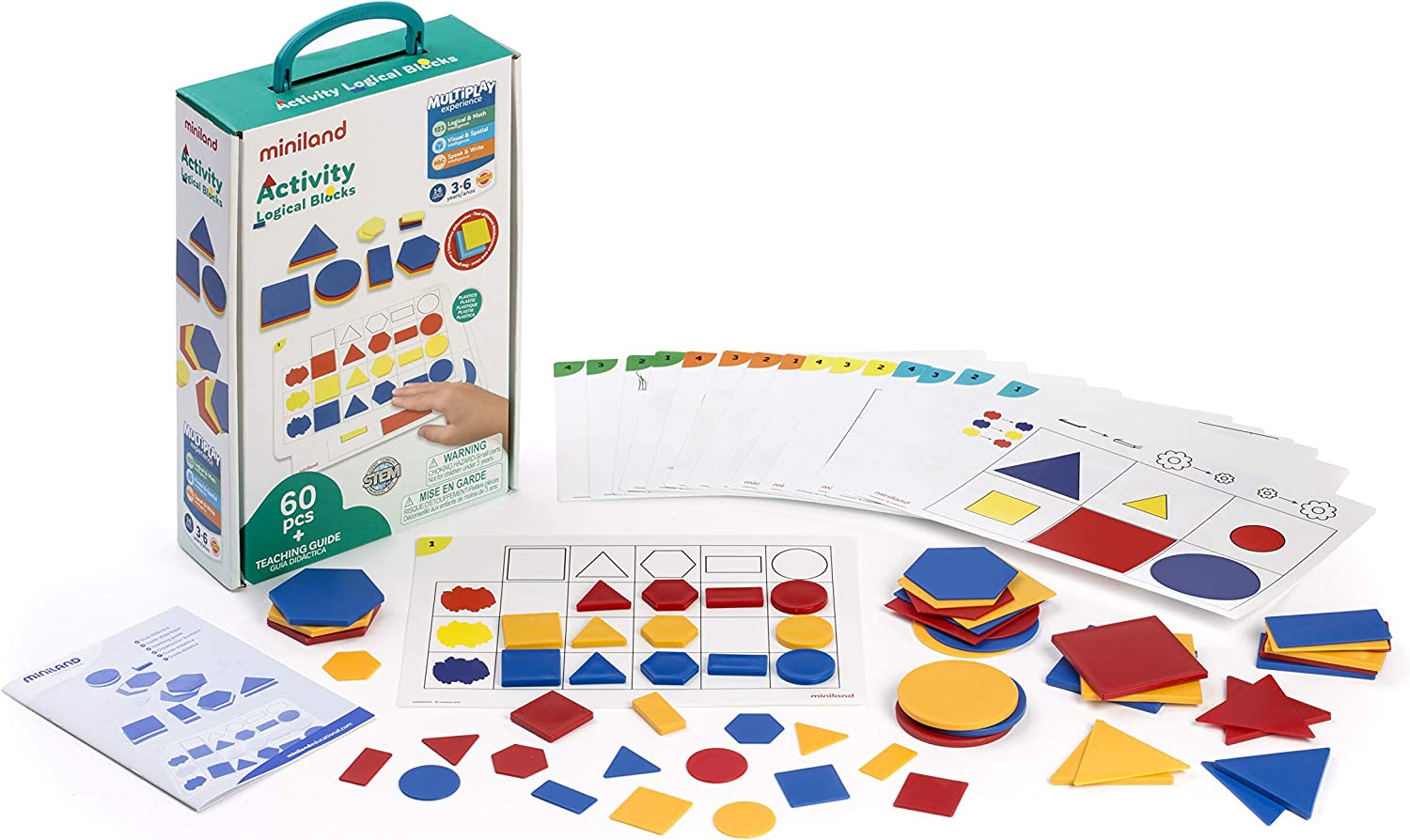 Produzido em plástico resistente, este jogo apresenta 5 formas geométricas básicas: círculo, quadrado, triângulo, retângulo e hexágono, cada uma delas em 2 tamanhos, 2 espessuras e 3 cores. Isso permite que as crianças experimentem e descubram formas, tamanhos, cores e padrões, familiarizando-as assim com o mundo da geometria. Este é o recurso ideal para trabalhar e lidar com diferentes conceitos lógicos e matemáticos. O jogo é acompanhado por um pacote de folhas de atividades com 16 exercícios em ordem crescente de dificuldade, além de um guia do professor que explica como utilizar os blocos em diferentes áreas: