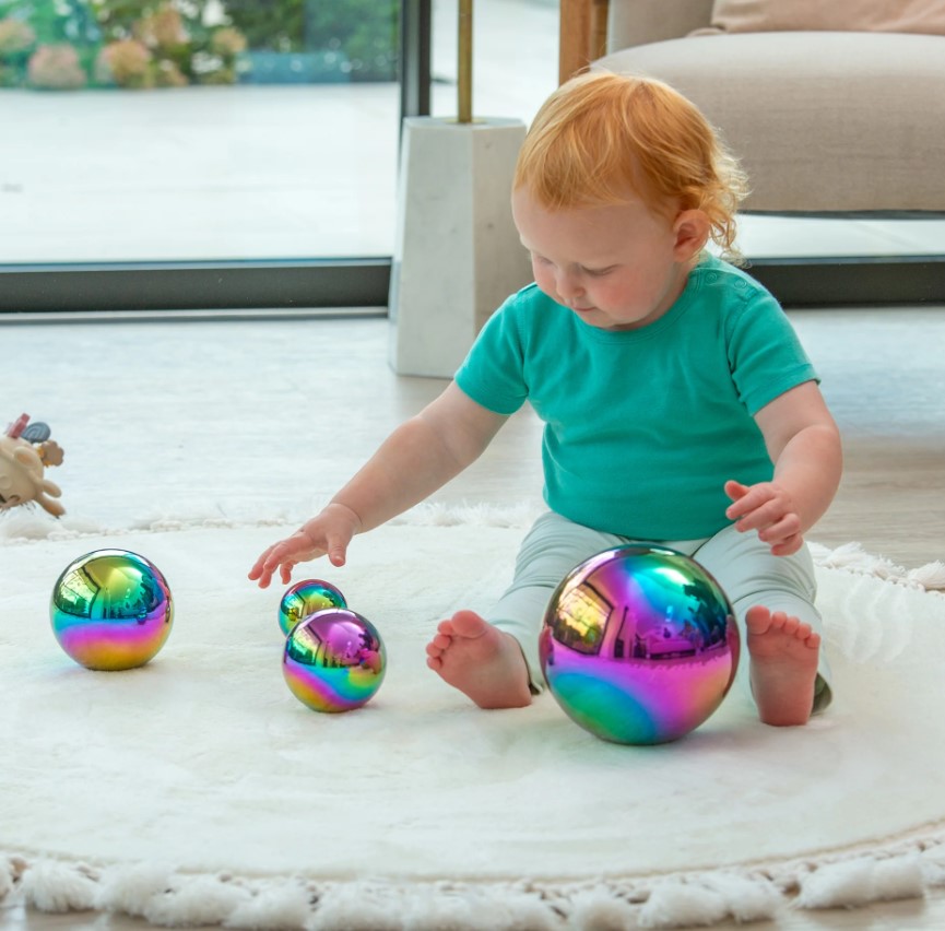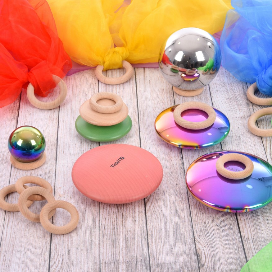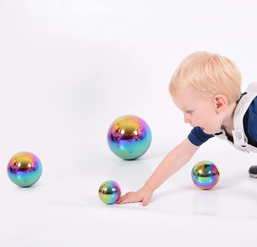 As bolas sensoriais refletoras Colour Burst da tickit são táteis e espelhadas, permitindo que a criança explore uma realidade divertida e distorcida, como se estivesse a olhar através de uma lente grande angular. As quatro bolas têm tamanhos graduados, com uma superfície polida que reflete a luz e cria um efeito arco-íris. Podem ser utilizadas tanto em interiores como no exterior, sendo também um recurso visual atrativo para exposições ou áreas sensoriais.