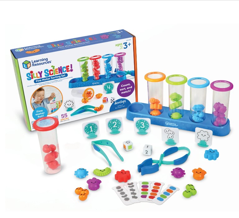 Usando as ferramentas de motricidade fina exclusivas deste conjunto, as crianças podem escolher e classificar.