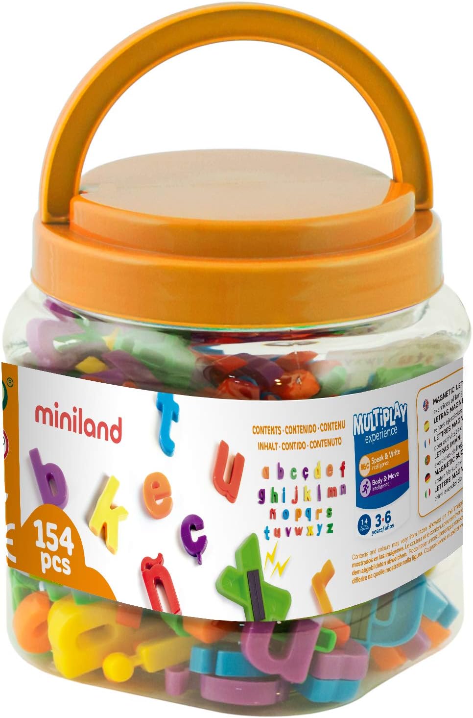 Estas letras minúsculas magnéticas de plástico em cores vibrantes são ferramentas versáteis para aprender a ler e escrever. Elas são projetadas para serem usadas em quadros-negros metálicos ou outras superfícies magnéticas. O conjunto geralmente inclui todas as letras minúsculas do alfabeto e, muitas vezes, caracteres especiais como "Ñ" e "Ç".