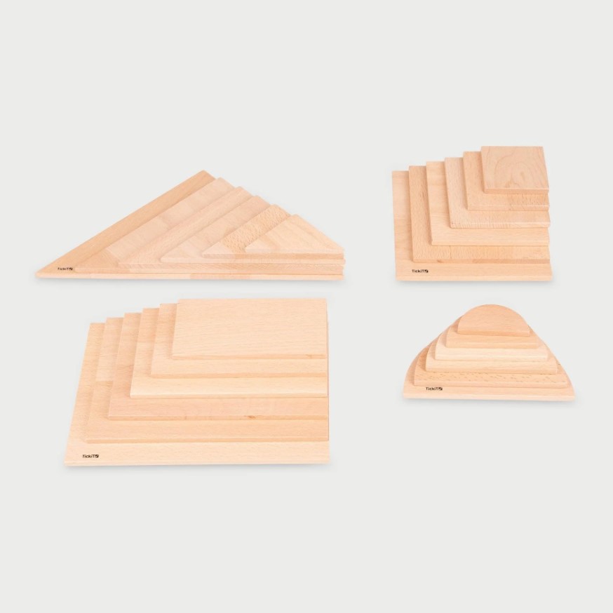 Este conjunto incentiva o jogo imaginativo e pode ser utilizado como tampas ou bases para edifícios em brincadeiras de “pequenos mundos” ou em atividades de classificação e agrupamento de formas.