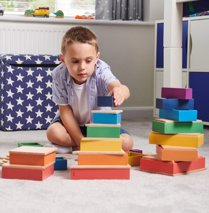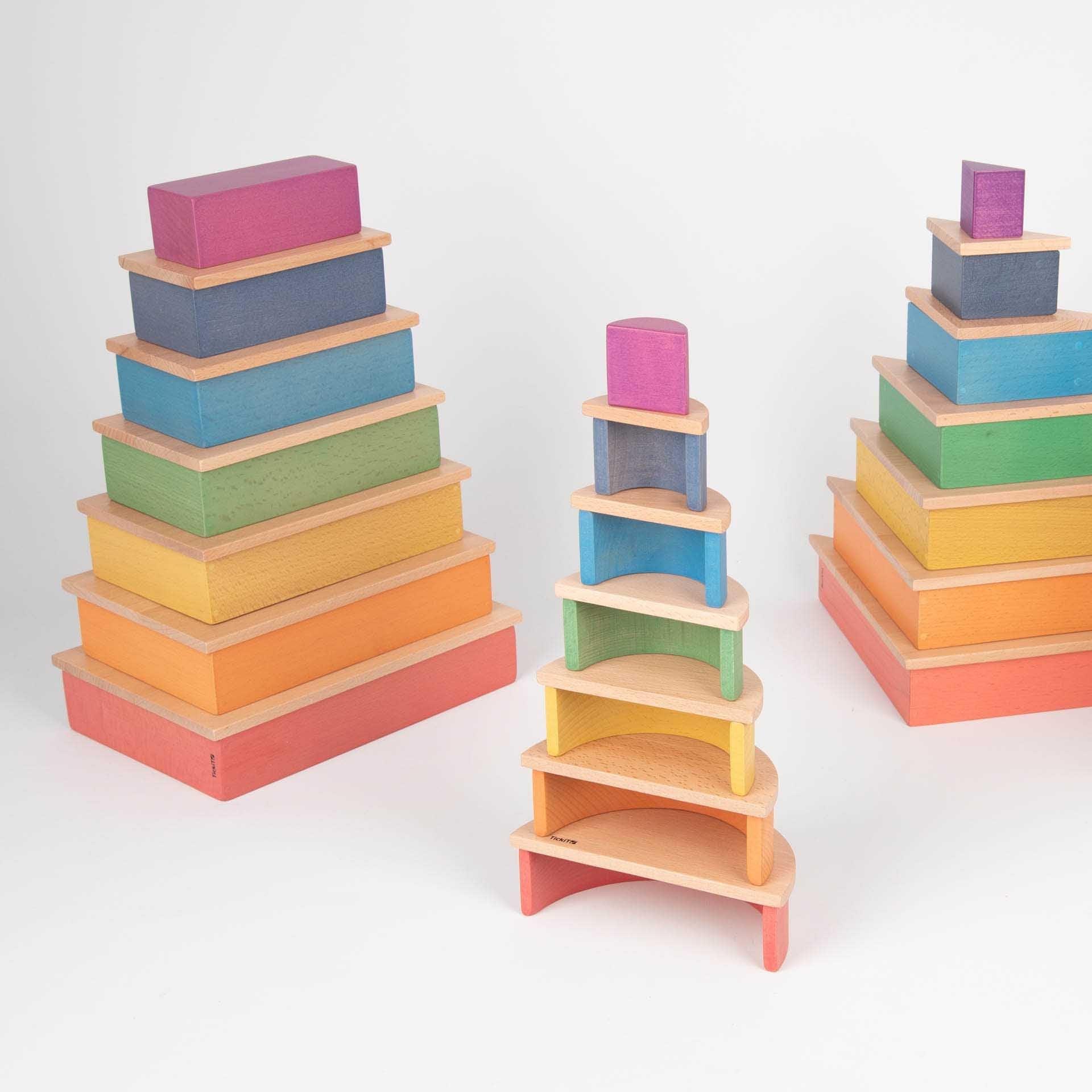 Este conjunto inclui 4 formas diferentes (arco, retângulo, quadrado e triângulo) e é uma excelente extensão para o nosso Rainbow Architect Set, permitindo que a criança construa estruturas mais altas e mais largas.