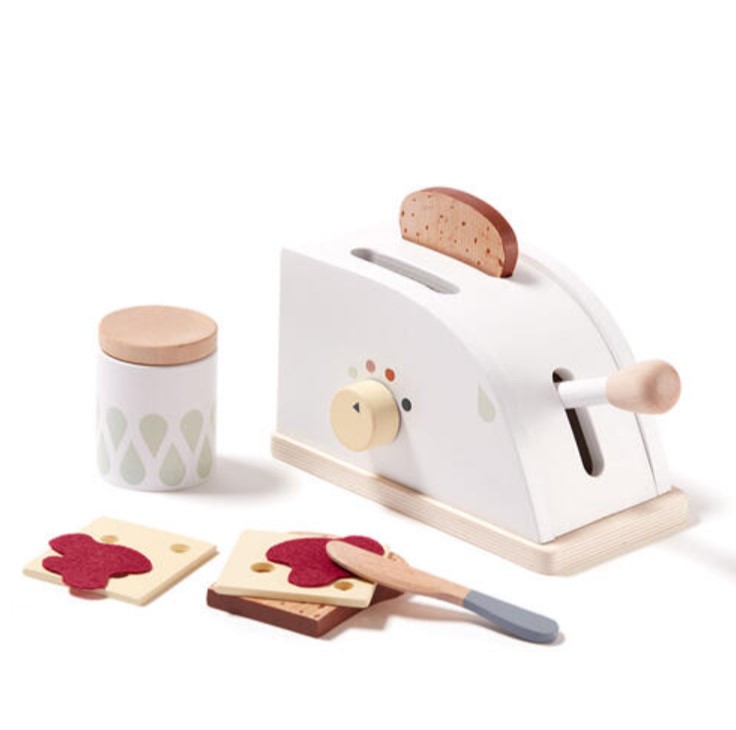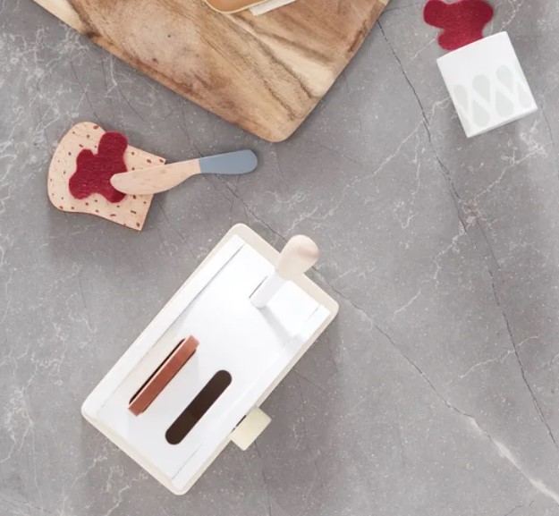 Este conjunto de torradeira em madeira inclui 8 acessórios para brincar. Use a alavanca para levantar as fatias de pão torradas e gire o botão para ajustar o calor.
