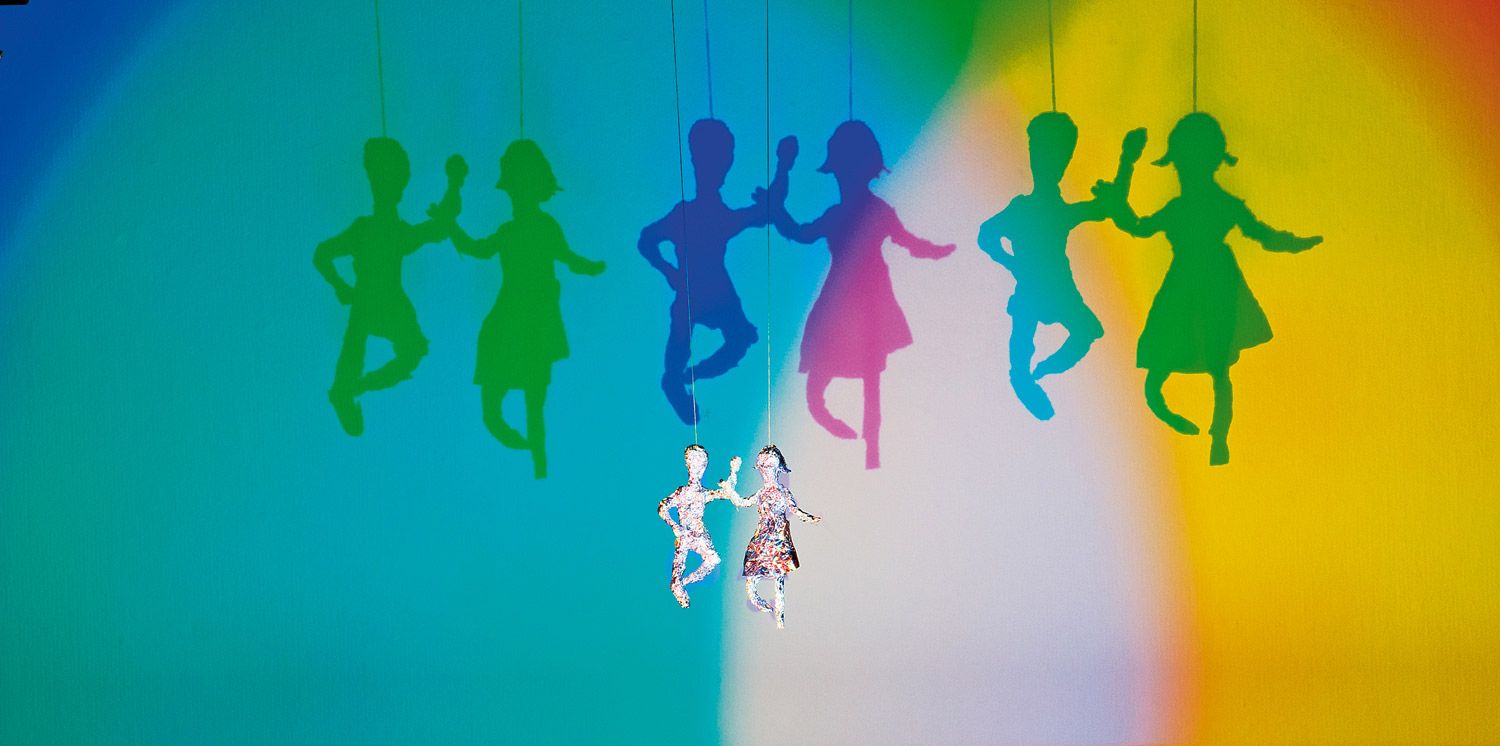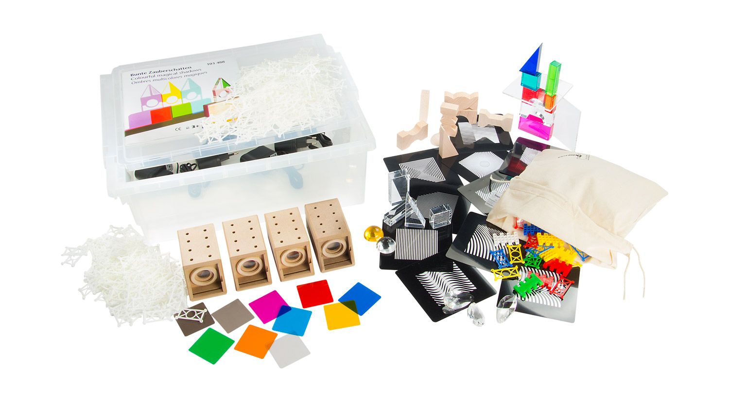 As folhas de transparência incluídas (3 tons de cinza e 7 cores do arco-íris) permitem criar sombras coloridas, pequenas obras de arte e experiências físicas sobre a teoria da cor.