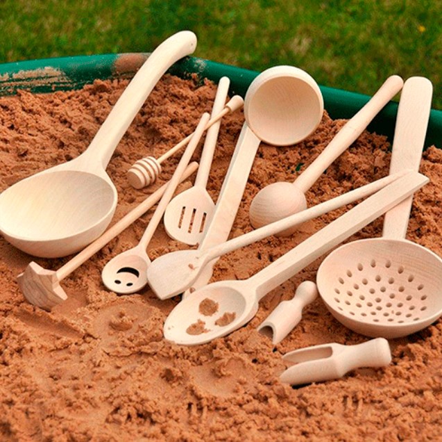 Um conjunto maravilhoso de diferentes utensílios de cozinha de madeira com um toque especial. Os designs e formas interessantes tornam-nos perfeitos para crianças curiosas explorarem.