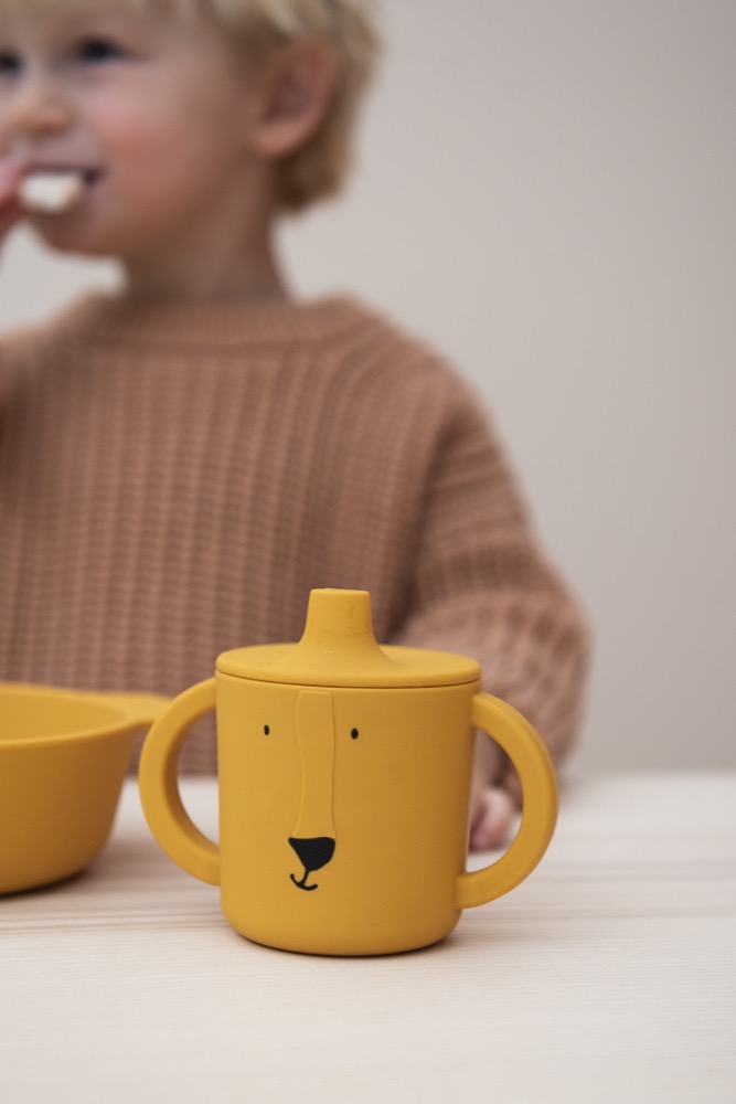A gama de loiça em silicone inclui prato, taça, copo, colher e copo de aprendizagem, todos disponíveis com 3 divertidos e simpáticos animais.