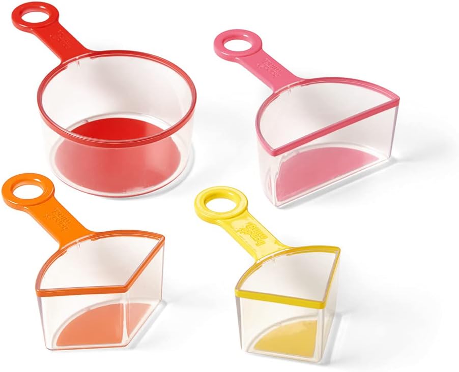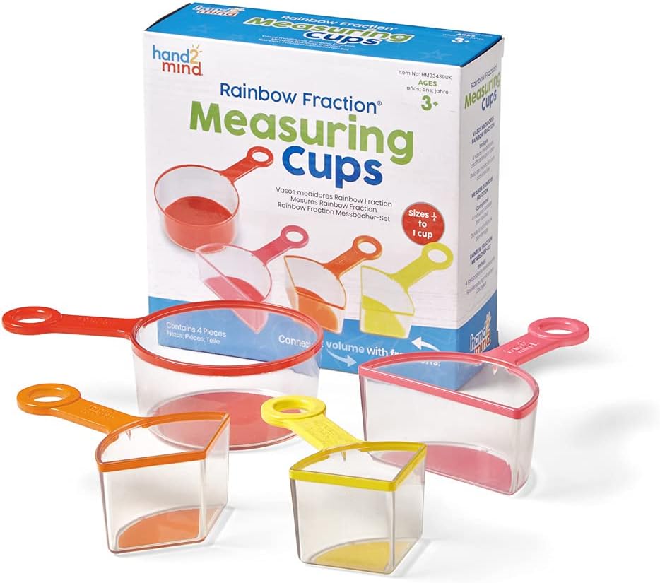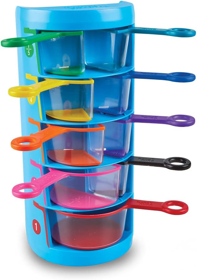 Cada uma tem uma base colorida para auxiliar as crianças a visualizar a fração, e lados transparentes para que possam ver o interior quando cheias com água, arroz cru ou outros materiais.
