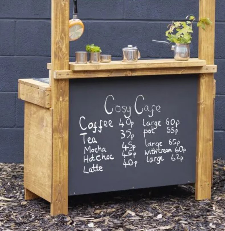 A Cozinha de Lama "Cosy Café" também vem com um painel frontal em quadro negro, perfeito para escrever o "prato do dia". Que tal uma Torta de Lama à la Shrek? A bancada fica a uma altura amigável para as crianças, tornando-a ideal para os chefs ansiosos começarem a misturar, amassar e salpicar à vontade.