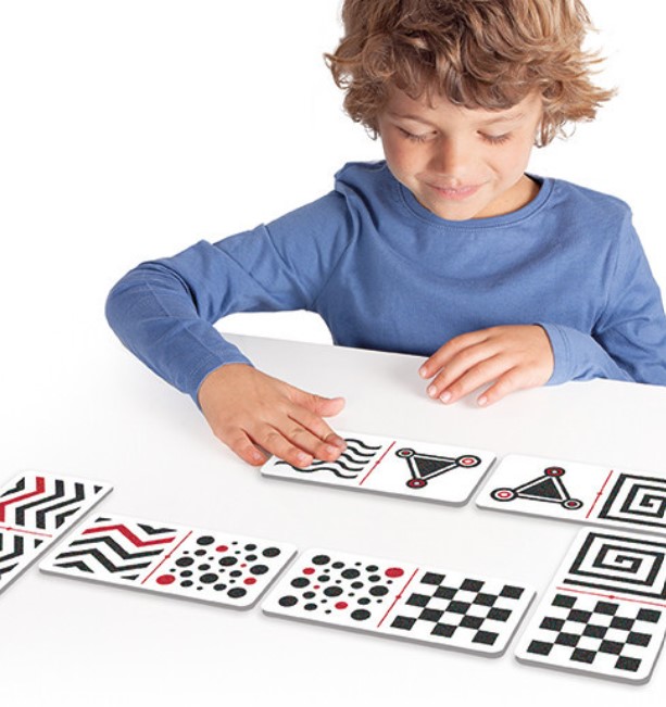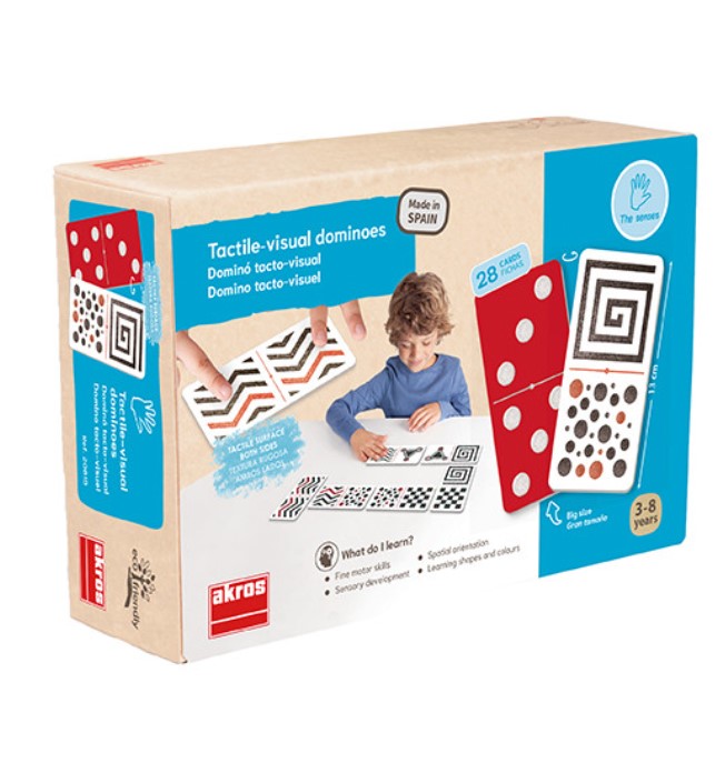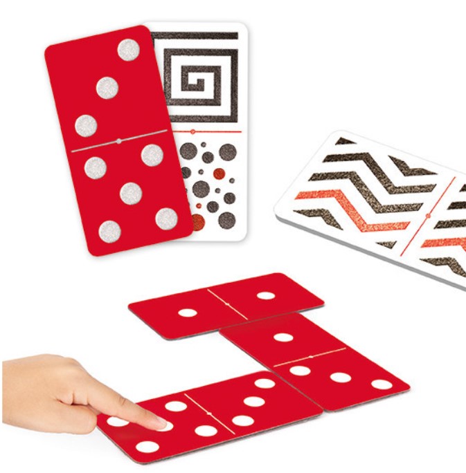 Jogo de dominó em formato grande com textura áspera em ambos os lados. Ilustrado com alto contraste, este jogo visa desenvolver a discriminação visual e tátil enquanto se joga dominó. Adequado para pessoas com deficiência visual.