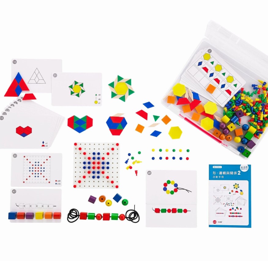 Inclui um livro de atividades coloridas, 25 cartões de atividades dupla face e 5 tipos diferentes de objetos táteis de matemática, incluindo 60 Blocos de Padrão, 200 Pequenos Pinos, 1 Placa de Pinos, 36 Contas para Enfiar e 2 Cordões.