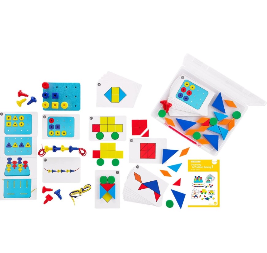 Inclui um livro de atividades coloridas, 54 cartões de atividades e 4 tipos diferentes de objetos táteis de matemática, incluindo 18 Geo Pinos, 1 Placa de Pinos, 3 Cordões e 50 Blocos de Formas.