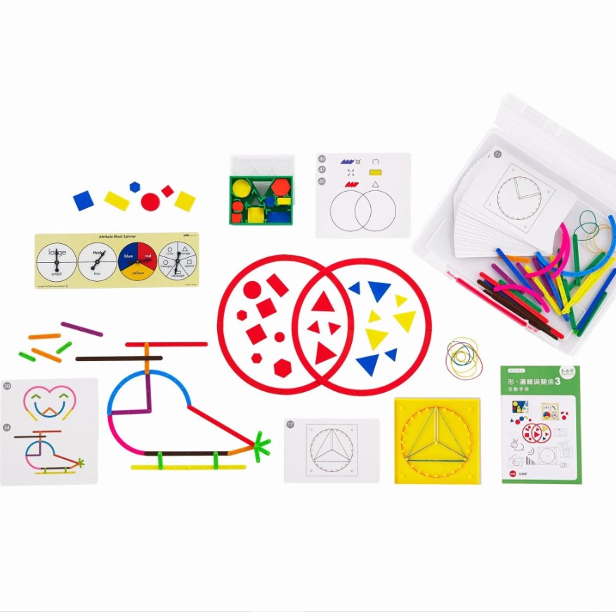 Conjunto inclui: Livro de atividades, 25 cartões de atividades dupla face e 5 tipos diferentes de objetos matemáticos. 1 Geoboard com 20 bandas elásticas, 50 Junior Geostix, 60 Blocos de Atributos, 1 Girador de Blocos de Atributos e 2 Círculos de Classificação.