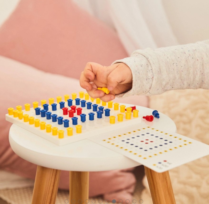 Conjunto inclui: 18 Geo Pinos, 1 Placa de Pinos, 3 Cordões, 50 Blocos de Formas, 54 cartões de atividades dupla face e guia de atividades numa caixa de plástico.
